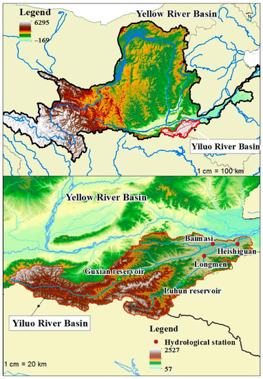 The Yiluo River Basin has important hydrological stations such as Baimasi, Longmen, and Heishiguan. Heishiguan stations (112°56′ E, 34°43′ N) was established in Gongyi, Henan Province in July 1934. It belongs to the Yiluo river system of the Yellow River Basin. The catchment area of the station is 18,563 km2, which is an important gateway to Yiluo. Baimasi station is located in the Luohe River, with a control basin area of 11,891 km2, accounting for 98.8% of the Luohe River Basin area; Longmen Town station has a control basin area of 5318 km2, accounting for 88.2% of the Yihe River Basin area.