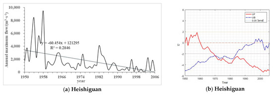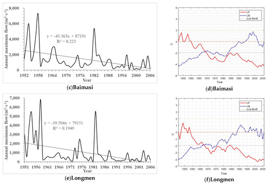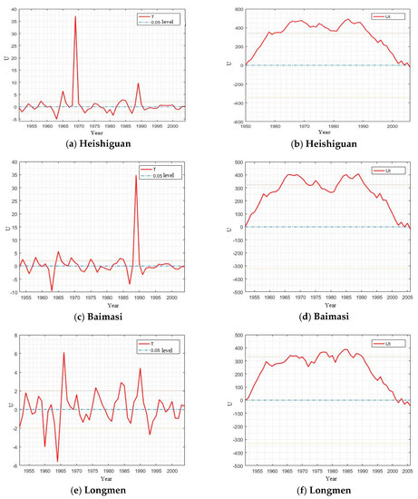 When the significance level is 0.05, the trend lines of annual maximum flows sequence of Heishiguan, Baimasi and Longmen stations show downward trend with obvious trend variation (Figure 2a,c,e). It was further verified by the Mann–Kendall test. Figure 2b,d,f all show that the UF began to exceed the threshold line in 1969 and showed a continuous decline.