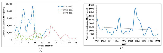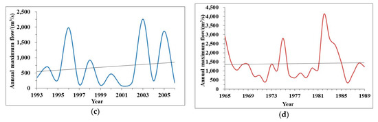 The literature [40] shows that Luhun reservoir was built in 1965 in Yiluo River Basin, which control and guidance projects were added in 1969. The controlled area of the Luhun reservoir is 3492 km2. The Guxian reservoir was first started built in 1958, but it was shut down and resumed many times. From 1978 to 1993, many temporary works such as diversion and trestle were built in the reservoir. The control area of the Guxian reservoir is 5370 km2, and the total capacity is 1.1758 billion m3. It was considered that after the construction of a large-scale water conservancy project, its operation would affect the flow. For example, at Heishiguan station, taking 1965 and 1993 as nodes, the annual maximum flow sequence is divided into three sections (Figure 4a), 1950–1965, 1965–1993, and 1993–2006. It can be seen that the construction of water conservancy projects will reduce the maximum discharge to a greater extent. Because of the early operation and smaller control area in the Luhun Reservoir basin, the reservoir’s regulatory capacity may have been curtailed under the 57-year long sequence in the study. The sequence’s inconsistency after the construction of the Luhun reservoir (post-1965) can be considered to be generated primarily by the Guxian reservoir. Then, the change of sequences from Heishiguan station after 1965, 1965–1992 (b), 1993–2006 (c), 1965–1989 (d), were studied in Figure 4. The hydrological sequence in 1965–1992 (Figure 4b) is decreasing, but the trend line is increasing in Figure 4c, which represents that the Guxian reservoir regulated the sequence in 1993–2006. The trend line of the sequence from 1965 to 1989 tends to horizontal, in Figure 4d, so 1989 is the most likely mutation point probably. It is consistent with the theoretical diagnosis and speculated that one reason for the variance is the watershed’s alteration during the Guxian Reservoir construction.