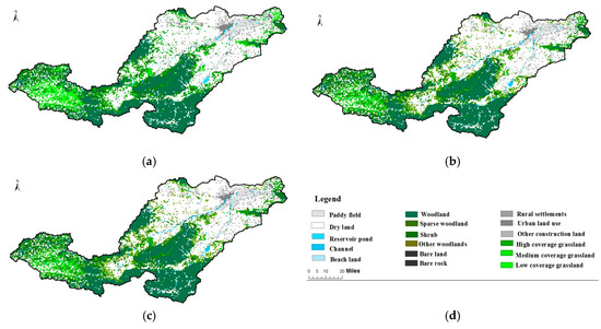 Spatial distribution of land use types in Yiluo River Basin in different periods. (a) In late 1997; (b) in the late 1980s; (c) in 1995; (d) legend.