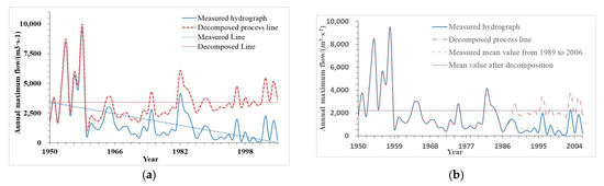 The annual maximum flow hydrograph after trend decomposition is gentler than before (Figure 6a). When = 0.05, the diagnosis results showed that there was no significant variation in the decomposed sequence. After the jump decomposition, the process line of the subsequence from 1989 to 2006 becomes gentler, and Figure 6b shows that the linear trend approaches the level. The significance level was 0.05, and the diagnosis of variability indicated that there was no remarkable variation in the sequence after jumping decomposition. Therefore, the time series decomposition method is feasible for this series. The design flood calculation can be carried out based on the decomposed series.