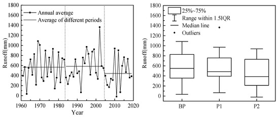 As shown in Figure 3, the average runoff depth in BP is 565.14 mm. The average runoff depth in P1 is 583.30 mm, which is 18.17 mm higher than that in BP. The average runoff depth in P2 is 440.84 mm, which is 124.30 mm less than that in BP. The runoff depth increased by 3.21% in P1 and decreased by 22.00% in P2 compared with BP. The Cv of runoff depth in P2 is larger than other periods, which means the inter-annual change of runoff depth in P2 is greater (Table 2).