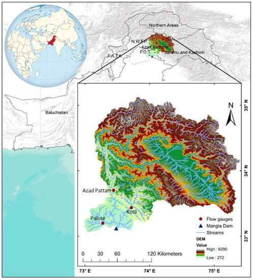 Mangla Dam is a multifunction dam situated on Jhelum River in Mirpur, Azad Kashmir, Pakistan. The dam was constructed in 1967 and is located about 108 km south-east from Pakistan’s capital, Islamabad. The total catchment area of the Jhelum River Basin (JRB) up to the dam site is 33,397 km2, while the river length is about 725 km. The dam is geographically located at 33°00′ N–35°12′ N and longitudes of 73°07′ E–75°40′ E (Figure 1). A majority of the catchment area consists of hills and rugged mountains with elevations varying from 272 m above sea level (a.s.l.) to 6290 m a.s.l. The northern part of the basin is covered by snowcapped mountains. About 45% of the watershed areas of JRB is found in Pakistan administered Kashmir, while the remaining 55% lies in Indian-administered Kashmir [27]. The slope of the JRB watershed is distributed into three ranges: undulating lands: 0–3%, steep slopes: 8–30%, and mountainous landL more than 30% [21]. A major part of the watershed consists of mountainous land and steep slopes.