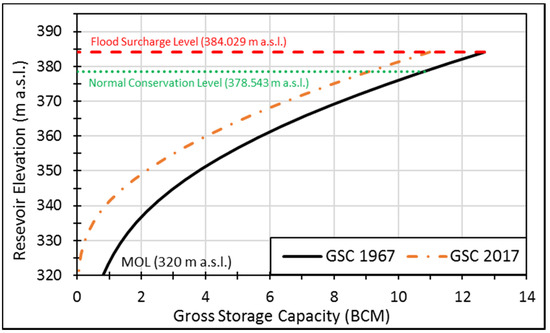 The Mangla Reservoir has a total initial gross storage capacity (GSC) of 7.25 billion cubic meters (BCM) at the normal conservation level (NCL) of 366.35 m a.s.l., while it has a dead storage capacity of 0.66 BCM at the previous minimum operating level (MOL) of 316.99 m a.s.l. Between the years 1967–2010, the reservoir lost storage capacity equal to 1.59 BCM (21.93%) owing to reservoir siltation. To enhance the impounding capacity and raise the hydropower potential of Mangla dam, a dam raising Project in 2012 was undertaken, which led to an increase in dam height by 9 m (from 366.35 m a.s.l. to 378.543 m a.s.l.). Thus, the net enhanced storage capacity of the upraised Mangla Dam is 3.451 BCM with a GSC of 9.11 BCM at the updated conservation level. The additional 3.451 BCM of water that is greater than the lost storage capacity during 1967–2010 will also produce an additional 644 million energy units annually and irrigate 0.53 million hectares of land. Moreover, the raised Mangla Dam would reduce the flood menace by decreasing the magnitude of flood as well as fulfilling the increasing irrigation demand. Reservoir levels and corresponding GSC are shown in Figure 2.