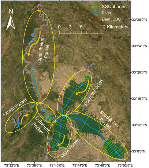 Mangla Reservoir pockets and cross sections location.