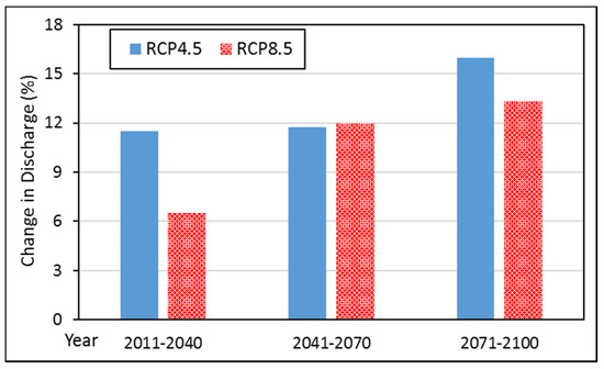 To envisage the impact of climate change on sedimentation at the Mangla Dam, future projected hydrological data (2018–2100) of all the tributaries of the Mangla Reservoir under RCP4.5 and RCP8.5 by Naeem et al. [22,32] were used in the numerical model as the upstream boundary condition. Naeem et al. [22,32] conducted a study on the Mangla watershed and explored the impacts of climate change on Mangla Dam hydrology using the soil and water assessment tool (SWAT). For assessing the climate change impacts on flow regimes for three future periods (2011–2040, 2041–2070, and 2071–2100), three Global Circulation Models (GCMs) (CanESM2, BCC-CSM1-1, and MICROC5), and two representative concentration pathways (RCP4.5 and RCP8.5) with two downscaling methods (Statistical Downscaling Model (SDSM) and Long Ashton Research Station Weather Generator (LARS-WG)). According to his statistical analysis results, BCC-CSM1-1 with SDSM performed better as compared to other models for the Mangla Dam watershed. Under RCP4.5 and RCP8.5, percent increase in observed discharges is shown in Figure 4.