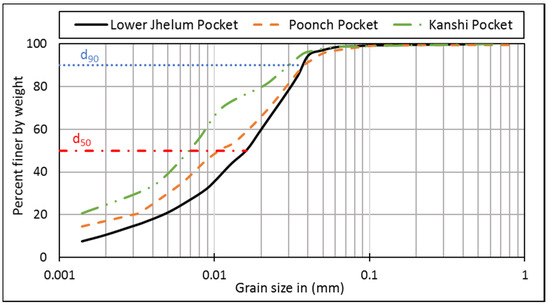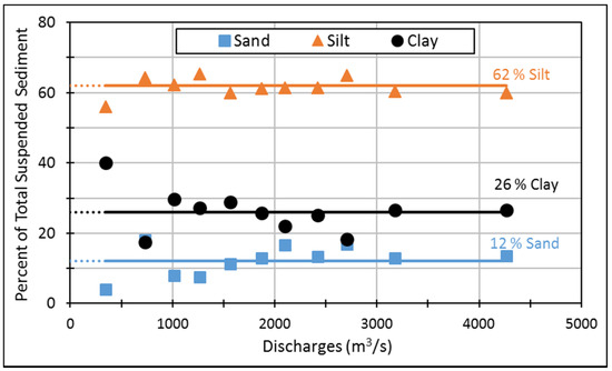 The SSC data is recorded in units of parts per million (ppm). The breakup of the SSC data expresses the percentage of its three constituents i.e., sand, silt, and clay. The average percentage of clay, silt and sand in the SS at Azad Pattan gauging station is 26%, 62%, and 12%; that at Kotli gauging station is 27%, 65%, and 8%; and at Palote gauging station is 32%, 58%, and 10%, respectively. Figure 5 presents the SSC for the Jhelum River at the Azad Pattan gauging station of Jhelum River for different flows. From the pit sample, the riverbed gradation curve for different Mangla Reservoir pockets is shown in Figure 6.