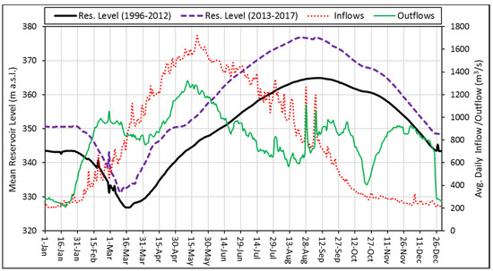 The reservoir operational levels at the dam site follow an annual fill and drawdown cycle: the water level starts to increase in April, reaches a maximum during the months of August and September, and then drop, attaining a minimum level in the month of March (Figure 7).