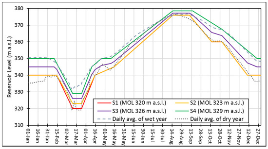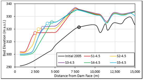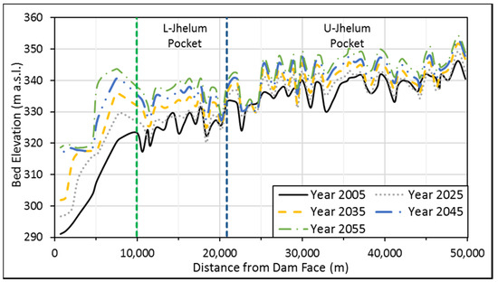 This paper analyzes five feasible scenarios (S1–S5) with the change in minimum operation level (MOL) for up-to year 2065. For the first (S1), second (S2), third (S3), and fourth scenarios (S4), the MOL was kept at 320 m a.s.l., 323 m a.s.l., 326 m a.s.l., and 329 m a.s.l., respectively, for the next 58 years from year 2017 onward, as shown in Figure 8. Further, the fifth scenario (S5), envisaged an increase of 0.75 m in MOL of every year starting from 320 m a.s.l. to 329 m a.s.l. for next 12 year, then MOL remained fixed at 329 m a.s.l. for the remainder of the duration up to the year 2065. In practical terms, the above strategies are a measure to reduce the rate of sediment delta movement towards the dam face.