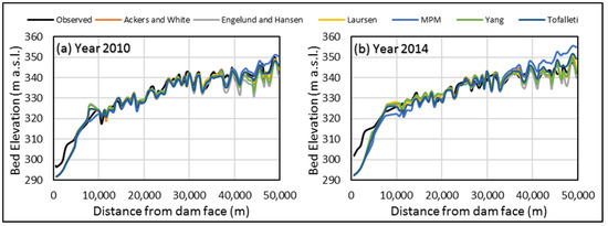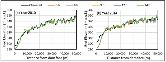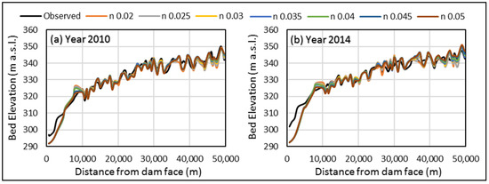 Sensitivity analysis for the selection of certain parameters like roughness coefficients, computational time step, sediment transport functions, and fall velocity was performed to simulate bathymetric changes in the reservoir. After importing all the input data to the HEC-RAS model, the model was run for different Manning’s values going from 0.02 to 0.04 with the incremented by 0.005 and by keeping a computational time step of 12 h with the model default sediment parameters (the Ackers and White method as the sediment transport function, Exner 5 as the bed sorting method, and Report 12 as the fall velocity method). It is found that low values of n lead to high erosion and cause high sediment transport rates because of the higher flow velocities. The simulated bed profile for Manning’s value of 0.03 was found to agree closely with the observed bed level (Figure 9), and statistical analysis also showed that the value of n = 0.03 is the most suitable one because it has a minimum RMSE value and NSE, R2 value is close to 1 as shown in Table 2. Thus, n = 0.03 was adopted as the project default value. Further, it has also been observed that the increasing value of n from 0.02 to 0.03 leads to the computed bed profile closer to the measured profile, and its further increased value (n = 0.035) shows more deviation from the observed. Thus, it is observed that a nonlinear relation exists between reservoir sedimentation and the Manning’s roughness coefficient.
