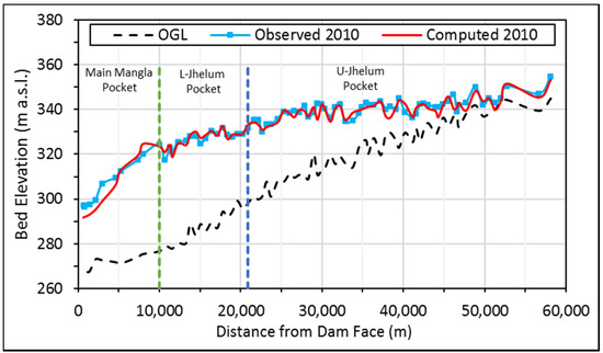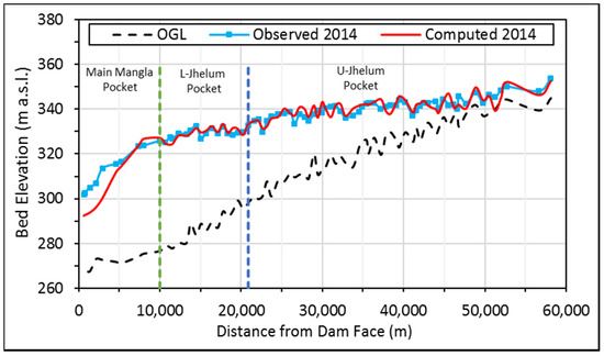 Daily reservoir level data measured by the Mangla Dam Organization (MDO) of WAPDA for the duration of 2005–2017 (18 years) was employed as a downstream boundary condition to calibrate the numerical model. For the future prediction after year 2017, the reservoir levels have been derived through various management scenarios of the reservoir operational rules.