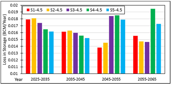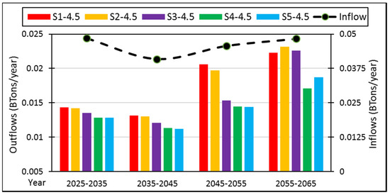 The observed sediment deposition rate at the Mangla Reservoir from 2005–2017 was about 0.023 BCM per year, while rates of deposition for future years under impact of climate change with different reservoir operational rules are show in Table 9. The sediment deposition rate increases from 0.023 BCM to 0.032 BCM per year due to the increase in summer precipitation and discharges due to climate change, which causes more weathering and erosion in the Mangla catchment area. It also indicates that the deposition rate decreases gradually with the passage of time because total sediments outflows are increasing, as shown in Figure 17.