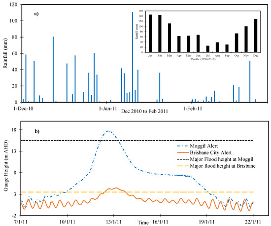 (a) Daily rainfall (2010–2011) and mean annual rainfall (1999–2018) at the Brisbane city office [40]; (b) Observed water level during the 2011 flood at Moggill and Brisbane city gauges, with reference to major floods.