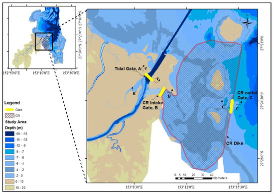 The proposed CR will be used to minimize the flood levels in the Brisbane River during the high flood period, meaning that it would need enough size to store excess floodwater routed into it. In extreme flood events and during high tide, the CR intake and tidal gate would be operated to control floodwater in the BRE. For the design of the CR, the following key parameters need to be considered: site selection and arrangement of the dike alignment; area and shape of the CR; intake gate size and position; and the operation of a gate [50].