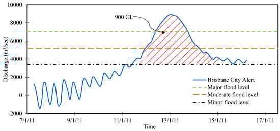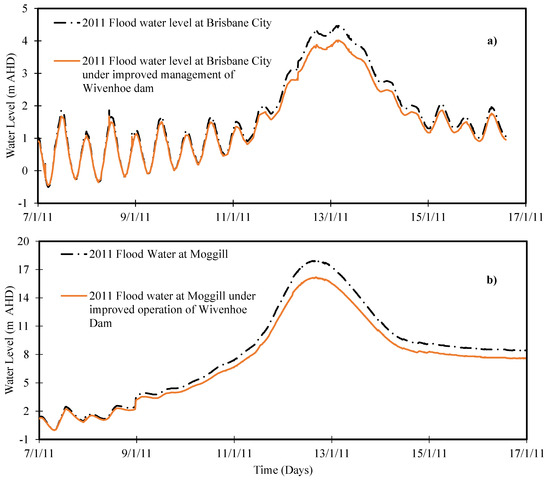 Managing a flood downstream of the Wivenhoe dam involves control of dam releases and downstream catchment flows. The dam operator operates the dam in such a way that the combined flow at Moggill should not be more than 4000 m3/s [52]. Under an improved flood mitigation strategy for the dam, the 2011 flood could have been reduced by 5 to 10%. With the installation of another spillway, the 2011 flood could be reduced up to 12.4%. Taking into account the improved flood management scenario of the Wivenhoe Dam, the flood peak at the Brisbane city gauge for the 2011 flood peak could have been reduced from 4.46 m AHD to approximately 4 m AHD [52], as shown in Figure 12a,b.