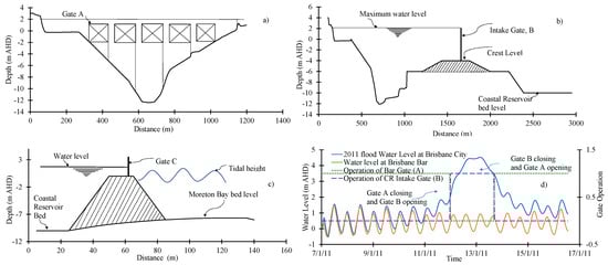 Schematics of gates: (a) Section A-A, Brisbane bar gate, A; (b) Section B-B, River mouth and CR intake gate, B; (c) Section C-C, Dike and outlet gate, C; (d) Gates operation for the 2011 flood event.