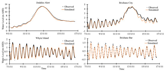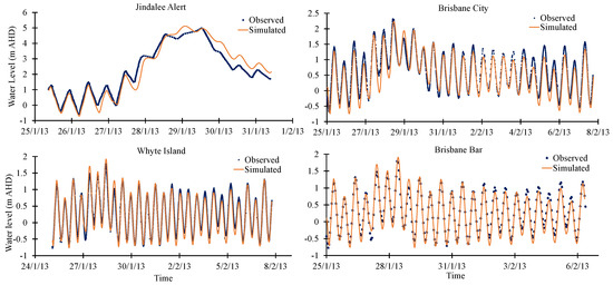 The hydrodynamic model was calibrated using the variable Manning’s n (Table 3). The observed water levels at four gauge stations (viz. Jindalee Alert, Brisbane City Alert, Brisbane Bar, and Whyte Island) for the period from 25 January to 7 February 2013 were used to calibrate the hydrodynamic model. A comparison between simulated and observed water levels is shown in Figure 6. Root-Mean-Square Error (RMSE), Nash–Sutcliffe coefficient (Ens), and percentage error in peak value were used to evaluate the performance of the model. The performance indices for calibrating gauging stations are shown in Table 5. The statistical results showed that Ens of water levels varied between 0.87 and 0.97, and RMSE values were less than 0.45, which showed a satisfactory match between the observed and simulated water levels.