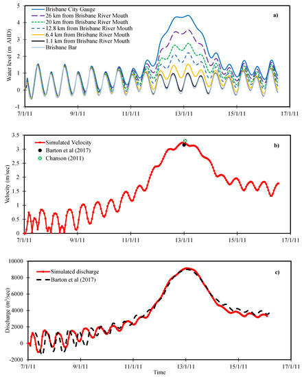(a) Simulated water level for the 2011 flood in Brisbane River estuary from Brisbane city gauge to Brisbane Bar; (b) Simulated velocity for the 2011 flood in the BRE at Brisbane city gauge; (c) Simulated discharge for the 2011 flood in the BRE at Brisbane city gauge.