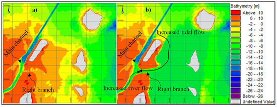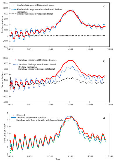 Under normal conditions, the flow distribution in the BRE is such that almost 99% of water goes straight into the Moreton Bay, while the right branch of the Brisbane River contributes only 1% of water towards the Moreton bay (Figure 9 and Figure 10a,b). When the right branch of the Brisbane River was widened by 500 m and dredged to −4 m (Figure 9), the flow towards the right branch increased by approximately 30% (Figure 10a,b). The acceleration in discharge could be due to enlarged frictional damping of the tide wave as suggested by others [55,56].