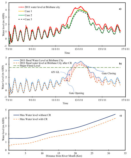 Three different gate operation scenarios showed water level reductions of 10, 11, and 13% respectively, as shown in Figure 11a. For example in case 3, at the start of the simulation, with gate A opened and gate B closed, the water level remained almost unaffected in the BRE. This changed on 12 January 2011 at 12:05 am as the gate operation changed. The water level started decreasing due to the increase in flow velocity and reduced friction from tidal water in the BRE. It reduced the peak water level from 4.46 m AHD to 3.88 m AHD, with an overall 0.58 m (13%) reduction in peak water level, while 716 GL of volume adaptation occurred due to the reduction in water level at the Brisbane city gauge as shown in Figure 11b. After opening the CR intake gate, there was a sudden reduction of water at the mouth of the river and a greater mass of water entered the CR. However, after the first drawdown, the flow inside the CR became quite stable and followed a steady pattern. Figure 11c shows the comparison of water levels in the BRE with and without the CR from the Brisbane city gauge to the river mouth. The water level started to converge with a normal water level profile as it moved upstream in the estuary. At the mouth, the water level reduction was 0.95 m AHD while at the Brisbane city gauge it reduced by up to 0.58 m.