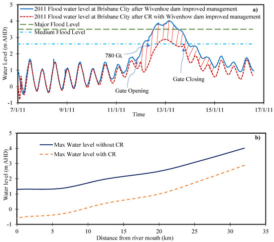 CR operation under the improved flood management regime was analysed with changing upstream boundary conditions at Moggill. Simulation results showed that the peak water level of 4 m at the Brisbane city gauge would have been reduced to 2.87 m AHD (approximately 28.3%) with CR operation, which is substantially below the maximum flood water level (3.5 m AHD), and 780 GL of volume adaptation would have occurred at the Brisbane city gauge due to lowering of the water level there, as shown in Figure 13a. The comparison of water levels in the BRE is shown in Figure 13b, where the negative levels indicate the water level to be below the datum height. At the mouth, the water level reduction was 2 m AHD while at the Brisbane city gauge it reduced up to 1.58 m. It is therefore clear that the operation of a CR under the improved flood management scenario of the Wivenhoe dam would have reduced the flood peak for the 2011 flood to well below the maximum flood water level, which would have significantly reduced infrastructure damage and lives lost.