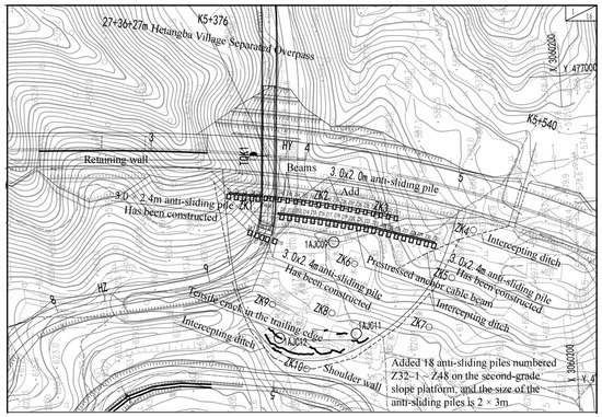 On 28 September 2014, cracking occurred on the right slope of the K5 + 385 to K5 + 500 section. The cracks were intermittently continuous arcs, ranging from a few to a dozen meters long, 1–3 cm wide and 0.4–2.0 m deep. The second stage of reinforcement was thus designed and constructed between October 2015 and December 2016. The construction of the anti-sliding piles for the three-stage platform in section K5 + 336 to K5 + 500 was completed. The cross-section of the anti-sliding piles was 3 m × 2.4 m and the pile spacing was 5.0 m. An additional anchor beam was added to the top of the anti-sliding pile, using a 6 Φs 15.24 anchor cable tilted 28° with a hole diameter of 130 mm. The anti-sliding piles were numbered Z11 to Z17, the length of the anchor cable was 33 m, the anchoring section was 11 m long, and 750 kN of prestress was applied. A row of anchor cable anti-sliding piles was also added to the secondary platform of the slope, and the top of the pile was connected by beams. These anti-slide piles were 33 to 34 m long. The pile top anchor cable was of the 6 Φs 15.24 dispersion type, angled 20° downhill with a drilling hole diameter of 130 mm, and it had an anchoring section length of 12 m and 750 kN of prestress. The tops of piles Z47 and Z48 were not anchored by cable. The first grade used a window hole-type retaining wall, and the fourth grade used rhombic grid planting grass to protect the slope.