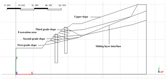 Anti-sliding piles were added at the third-level platform. The cross-sectional dimensions of the anti-sliding piles were 3 m × 1 m, and the length of the piles was 30 m. Three levels of anchor cables were added for grades 2 and 3. The slope was reinforced every 3 m by prestressed anchor cable with a downward tilt of 20°. The total length of anchor cable was 20 m, the anchor section was 10 m long, and the anchor cable prestress was 500 kN. In the model of the second support construction stage, an anchor cable beam was added to the top of the anti-sliding pile on the third-level platform. The anchor cable had a downward tilt of 28°, a length of 33 m, an anchor section of 11 m, and a prestress of 750 kN. The anti-sliding pile had a cross-section of 3 m × 1 m and a length of 33 m. The anchor cable at the top of the pile was angled downward by 20°, the anchor cable was 33 m long, the anchor was 12 m long, and the anchor cable was prestressed at 750 kN.