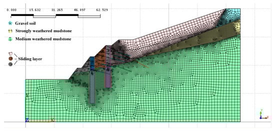 The Mohr–Coulomb elastoplastic strength criterion was used in the calculation. The initial stress is predominantly the stress from the self-weight of the geological formation. The model grid division follows the applicability principle, that is, the rock and soil body uses a quadrilateral and triangular plane element grid, the anti-slide pile uses a linear beam element grid, and the prestressed anchor cable anchor section uses a linear truss element grid. Grid densification is performed on the excavation slope, around the anti-slide pile and the interface position of the rock–soil layer. Based on the above assumptions and considerations, a model with a length, width, and height of 150 × 1 × 80 m, respectively, was established. The model had a total of 11,343 units and 22,841 nodes, as shown in Figure 4. The study selects the right side slope of the K5 + 220–K5 + 770 section of Jiangkou-Weng’an Expressway as a case, so the subgrade center line is used as the boundary line during modeling, that is, the X direction (u = 0) constraint is imposed on the subgrade boundary line.