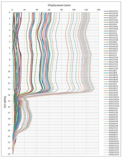 The deep displacement monitoring curves are shown in Figure 6 and Figure 7; it can be seen that monitoring points #9 (1AJC09) and #12 (IAJC12) have obvious intermediate displacements. At monitoring point #9 (1AJC09), the sliding surface was located 13.0–14.0 m deep. As of 29 August 2015 (prior to the second support construction), the cumulative maximum displacement of the sliding surface was 9.85 cm. The maximum cumulative displacement at monitoring point #9 over the entire monitoring period (13 January 2015 to the end of second support construction) was 12.6 cm. At monitoring point #12 (1AJC12), the depth of the sliding surface was 6.0–8.0 m. As of 29 August 2015, the maximum cumulative displacement at the sliding surface was 10.9 cm, and the maximum cumulative displacement over the entire monitoring period was 15.6 cm.