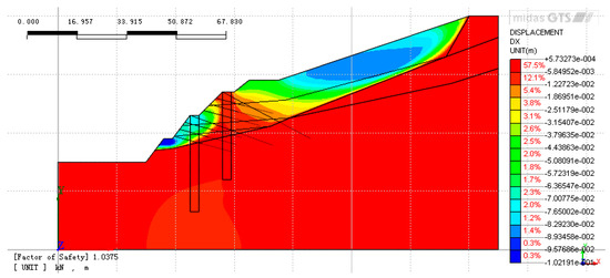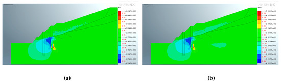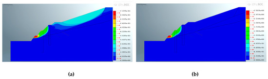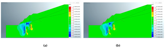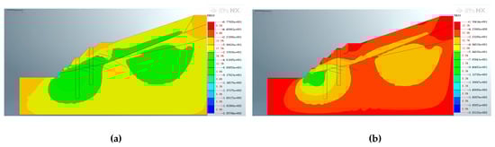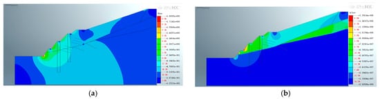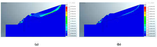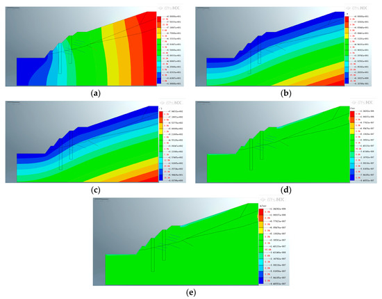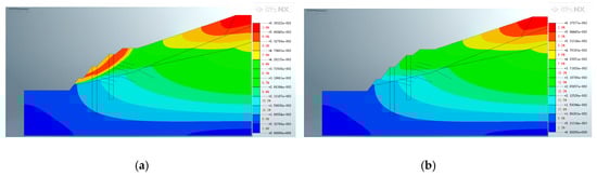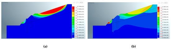 Figure 18, Figure 19 and Figure 20 depict the characteristics of the slope after the construction of the second support structure. Figure 18 shows that the application of pore water pressure has little effect on the location of the maximum displacement distribution after the secondary support is constructed on the dual-structure slope. However, it has a great influence on the size and position of the extreme value. After applying pore water pressure, the maximum displacement above the excavated slope decreased from 8.27889 × 10−1 m to 2.28734 × 10−1 m. Furthermore, the displacement of the shear outlet position of the potential slip plane decreased slightly from 4.82935 × 10−1 m to 2.74481 × 10−1 m after pore water pressure was applied.