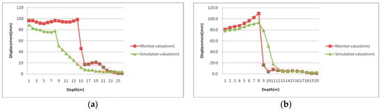 Horizontal displacement monitoring data and simulation data. (a) Location of hole 9 (p = 0.039); (b) Location of hole 12 (p = 0.793).