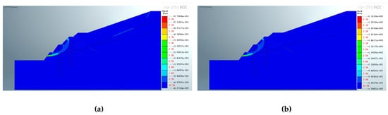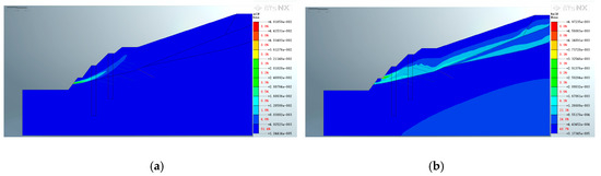 Figure 19 shows that the application of pore water pressure has an effect on the equivalent strain extreme value and distribution position of the binary structure slope. The distribution of equivalent strain extremums is reduced from three locations on the potential slip surface–above the slope the top of the anti-slide pile in the first construction and the shear outlet of the potential slip surface–to one location on the potential slip surface after the application of pore water pressure. The maximum equivalent strain extreme value is reduced from 3.43776 × 10−1 to 2.4729 × 10−1 after pore water pressure application. In short, the maximum equivalent strain and distribution along the potential slip surface above the slope are reduced. Thus, the application of pore water pressure has a positive effect on the stability of the binary structure above the slope after the second support is constructed.