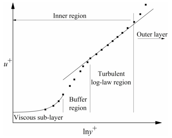 For a flow with a bed, when the mainstream has a fully developed turbulence flow, the flow can be divided into an inner region and an outer layer, depending on the normal distance from the bed (Figure 1). The outer layer is the fully developed turbulence flow. In the inner region, the flow is different from that in the outer layer because of the influence of the bed. The inner region can be divided into three sub-layers. Theoretically, the bed shear stress can be determined from measuring the velocity of the viscous sub-layer, according to the linear distribution of the velocity. However, because of the very thin viscous sub-layer, the normal distance from the bed is usually on the order of 0.1 mm, which is difficult to measure. PIV has been used to measure the velocity of viscous sub-layers, but the velocity of the flow should be limited to a low-velocity range. In addition, PIV has strict requirements for the measuring environment. Light conditions, sampling frequency, sampling size, etc., would affect the measurement results, and even the temperature of the water must be controlled within a stable range. Otherwise, changes to water temperature may also cause displacement of the laser disc and camera focus plane [9]. The viscous shear stress and turbulent shear stress in the buffer region are equivalent, the flow structure is complicated, and the velocity distribution cannot be expressed by a formula or law. In the turbulent log-law region, turbulent shear stress dominates, and the velocity distribution in this region conforms to logarithmic law distribution. Because the viscous sub-layer and buffer region account for a small proportion of the total flow depth, the velocity distribution of the full flow depth in a simple open channel generally conforms to a logarithmic law distribution; thus, bed shear stress can be obtained by fitting the logarithmic law to the flow velocity (the log-law method) [1,10]: