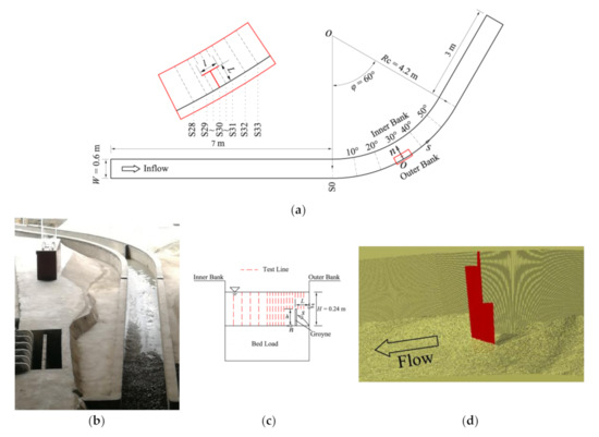 The experiment was carried out in a 0.6 m wide, 14.4 m long recirculating flume with a longitudinal slope (i) of 0.001, located in the Sichuan University’s State Key Laboratory of Hydraulics and Mountain River Engineering. The main channel consisted of a 7 m long upstream, a 60° channel bend with a centerline radius bend (Rc) of 4.2 m, and a 3 m long downstream straight reach. The groyne, with a thickness of 0.01 m, was positioned at the 30° center corner of the outer bank side of the bend. The length of the groyne wing and web was 0.1 m (Figure 2a). To stabilize the flow, an energy dissipation grid was placed at the inlet of the flume. The measured cross-sections S0–S33 corresponded to the central angles of 0–33°, respectively, of the bend. Figure 2c shows a vertical view of the section measurements in section S29.5, and Figure 2d is a three-dimensional illustration of the groyne with a submergence ratio (H − h)/h = 1.