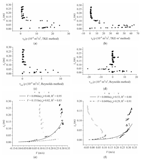 Where possible, the bed shear stress is usually extrapolated from the Reynolds stress at the bed [6,7]. Reynolds stress values measured directly near the bed can also be used [8].