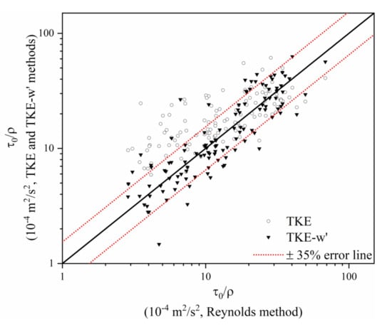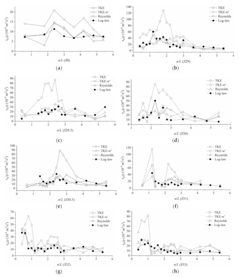 The bed shear stress values are generally considered close to the Reynolds stress values near the bed. The local bed shear stress can also be calculated by the Reynolds stress (Reynolds method) [3,5]: