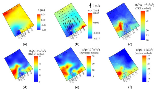 Figure 6a shows topographic illustrations of bed scouring around the groyne (positive values represent silting; negative values represent scouring). The scouring depth was the highest at the upstream head of the groyne, while sediment deposits occurred at the inner bank. Figure 6b shows the velocity distribution near the groyne. The velocity vectors indicate the depth-averaged velocity vectors (UV components) and depth-averaged vertical velocity-filled contours (W component, positive values represent the upward velocity). Figure 6c–f shows the bed shear stress contours (using the Kriging method) for the TKE, TKE-w′, Reynolds, and log-law methods, respectively. There were two high bed shear stress zones identified by the four methods. The first one was located on the upstream side near the groyne, where both the horizontal and vertical velocities were large; the second one was located on the downstream side at a distance from the groyne, where the horizontal velocity was lower than in the surrounding area, but the vertical velocity was higher than in the surrounding area, so the vertical velocity in this area contributed greatly to the formation of high bed shear stress. The bed shear stress in the second area was smaller than that in the first area, mainly because of the lower horizontal velocity (Figure 6b). Chrisohoides et al. (2003) and Biron et al. (2004) assumed that there was a strong correlation between the scouring area and high bed shear stress [14,20]. The four types of bed shear stress distribution contours identified in this study had certain similarities with the topographic contours. High bed shear stress corresponded to scouring area, but the bed shear stress in the deepest scouring area enclosed by the side wall and groyne wing on the upstream side of the groyne was relatively small and was mainly located in the back-flow zone with low velocity (Figure 6b).