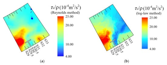 The overall magnitude of the bed shear stress is often of greater concern than the magnitudes of the directional components of the bed shear stress, especially the transverse bed shear stress. However, the transverse transport of sediment is closely related to the value of the transverse bed shear stress [21]. Figure 8a,b shows the transverse bed shear stress estimated by the Reynolds method and the log-law method, respectively. In Figure 8a,b, the difference is small in the high shear stress region, but large in the low shear stress region. Therefore, it is difficult to apply the logarithmic law to determine the transverse shear stress under the condition of low shear stress level (usually corresponding to low transverse velocity). The maximum transverse bed shear stress occurred near the groyne wing, upstream of the groyne, because the flow was blocked by the groyne and the streamlines were deflected, resulting in high transverse velocity (Figure 6b). Because of the high transverse bed shear stress, transverse sediment transport occurred, leading to the formation of large transverse scouring zones (Figure 6a).
