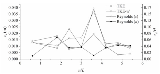 Figure 3a,b shows the shear stress distributions along the test line (n/L = 1.4, S29) according to the TKE method (Equation (1)) and TKE-w′ method (Equation (2)), respectively. The bed shear stress was the peak-value at about za = 0.05 m above the bed.