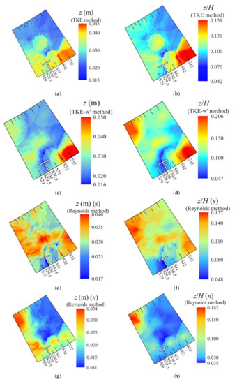 Peak-value heights near the groyne: (a,b) TKE method; (c,d) TKE-w′ method; (e,f) Reynolds method (s); (g,h) Reynolds method (n).