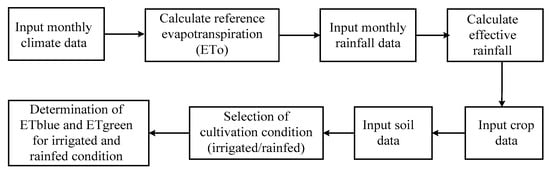 Flow diagram for major steps of CROPWAT 8 to calculate crop water evapotranspiration [30].