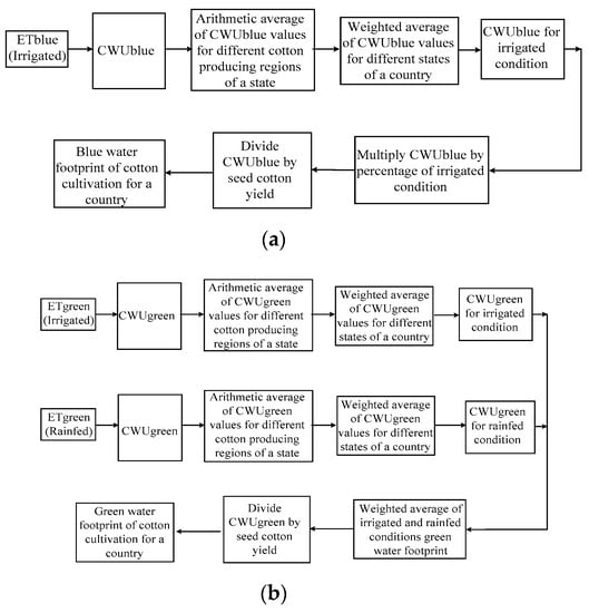 Flow diagram for calculation of (a) blue water footprint of cotton farming and (b) green water footprint of cotton farming for a country (recreated from [31]).