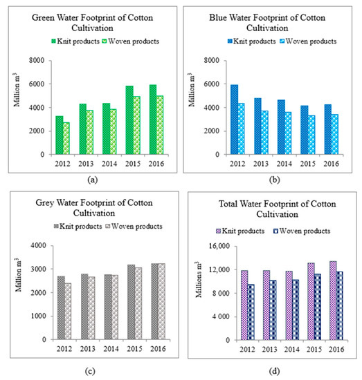 Figure 3 presents green, blue, grey water footprint and total water footprint of cotton cultivation for knit and woven products for the five years from 2012 through 2016. Water footprint of cotton cultivation for knit products is mostly higher than that of woven products. This is because around 60% of raw materials for knit products are met by local spinning mills; the remaining 40% comes from imported cotton yarn. On the other hand, for woven products, around 40% of raw materials comes from imported raw cotton, with the remaining 60% coming from imported cotton yarn and fabric. Local spinning mills use mostly the imported raw cotton to produce cotton yarn. In recent years, around 80% of this imported raw cotton comes from India, Uzbekistan and Africa, where green and blue water requirements for cotton production is much higher than China, from where a major amount of cotton yarn and cotton fabric is imported. As seen in Figure 3a,b, green water footprint for knit and woven products is increasing gradually and blue water footprint for knit and woven products is decreasing gradually. In 2012, green and blue water footprint of cotton cultivation for RMG products was found to be 5.98 and 10.21 billion m3, respectively, whereas, in 2016, the values were 10.87 and 7.65 billion m3, respectively. Currently, a larger percentage of raw cotton is imported from India, where around 65% of cotton is grown under a rainfed condition. The percentage of raw cotton imported from Uzbekistan is decreasing, where almost 100% of cotton is grown under an irrigated condition. Thus, over the years, green water footprint is increasing and blue water footprint is decreasing for both knit and woven products.