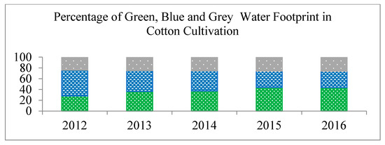 Percentage of green, blue and grey water footprint of cotton cultivation.