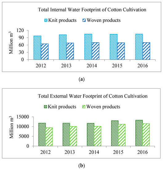 Total water footprint of cotton cultivation (a) internal water footprint and (b) external water footprint.