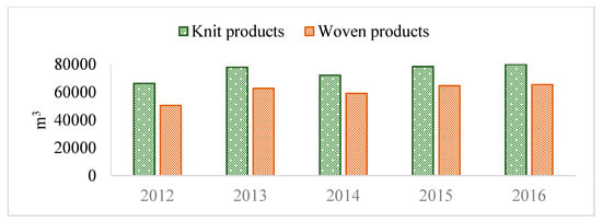 Figure 8 shows the total internal and external water footprint for the textile industry. In 2016, total internal water footprint of textile processing was 1820 million m3 (999 million m3 for knit fabric and 821 million m3 for woven fabric), whereas the total external water footprint of textile processing was 7.51 million m3 (0.97 million m3 for knit fabric and 6.54 million m3 for woven fabric). Total internal water footprint of textile processing was around 242 times higher than the total external water footprint of textile processing (in 2016).