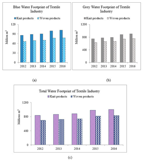 Water footprint of textile industry for knit and woven products: (a) blue water footprint, (b) grey water footprint and (c) total water footprint.