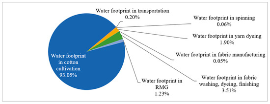 Figure 10 shows the percentage of water footprint in different stages of RMG production (from cotton cultivation to final product). The highest water footprint is in cotton cultivation, 93%; the second highest is for fabric washing, dyeing and finishing, 3.5%. Around 7% of total water footprint is associated with the textile industry. The percentage of water footprint in cotton cultivation is 93% of total water footprint because of a higher percentage of water consumption and pollution during cotton cultivation.