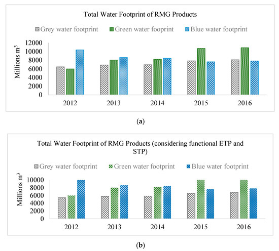 If it is considered that textile industries are running an ETP (effluent treatment plant) and STP (sewage treatment plant) as per national requirements (ECR 1997), the grey water footprint will be reduced, which is shown in Figure 11b; green and blue water footprint will remain same as the values calculated without considering ETP and STP. In 2016, grey water footprint was found to be 6.84 million m3, which is 22% lower than the grey water footprint calculated without considering ETP and STP.