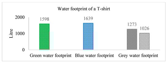 Water footprint of a T-shirt is estimated to be 4510 L, considering that the weight of one T-shirt is 250 g [48]. Among the total water footprint, green, blue and grey water footprints were found to be 1598 L, 1639 L and 1273 L, respectively (Figure 12). This calculation was made without considering ETP and STP. If ETP and STP are considered, grey water footprint for one T-shirt is reduced to 1026 L.